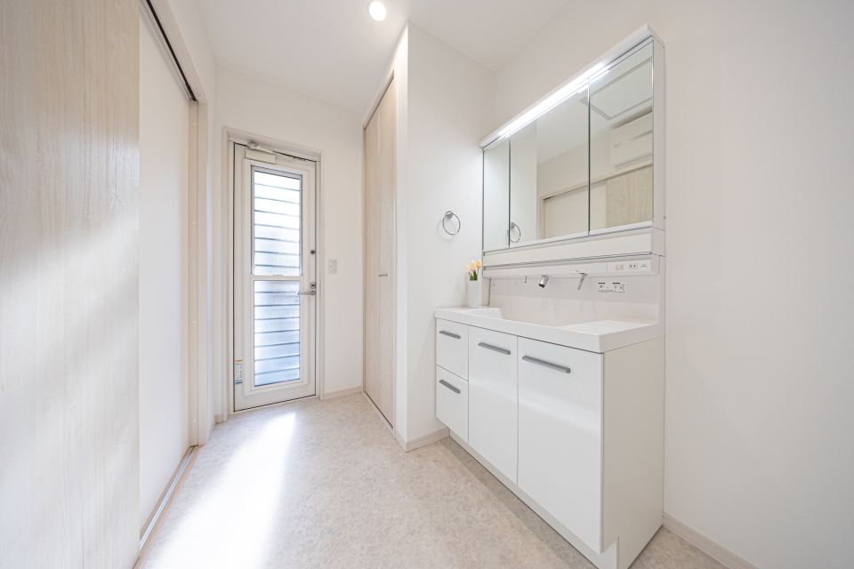 洗面台まわりは、複数人が使うことを想定しています。 鏡の前だけでなく、横に立って準備できる余地を持たせました。 勝手口につながる動線なので、外作業のあとも使いやすい配置です。