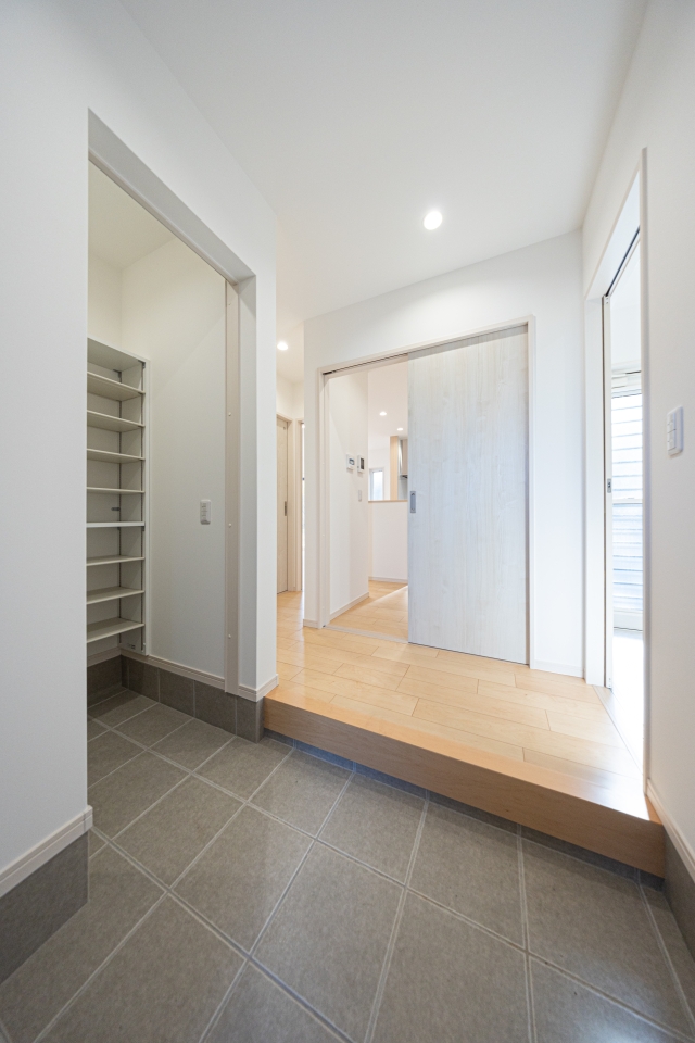 玄関土間は、人が立って靴を脱ぎ履きしても窮屈に感じにくい広さを確保しています。 荷物を持った状態でも動きやすく、玄関での動作が重なっても使いやすい空間です。 シューズクロークも土間に隣接しているため、 収納スペースを含めて玄関全体を広く使える構成になっています。
