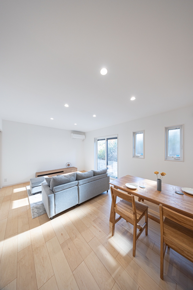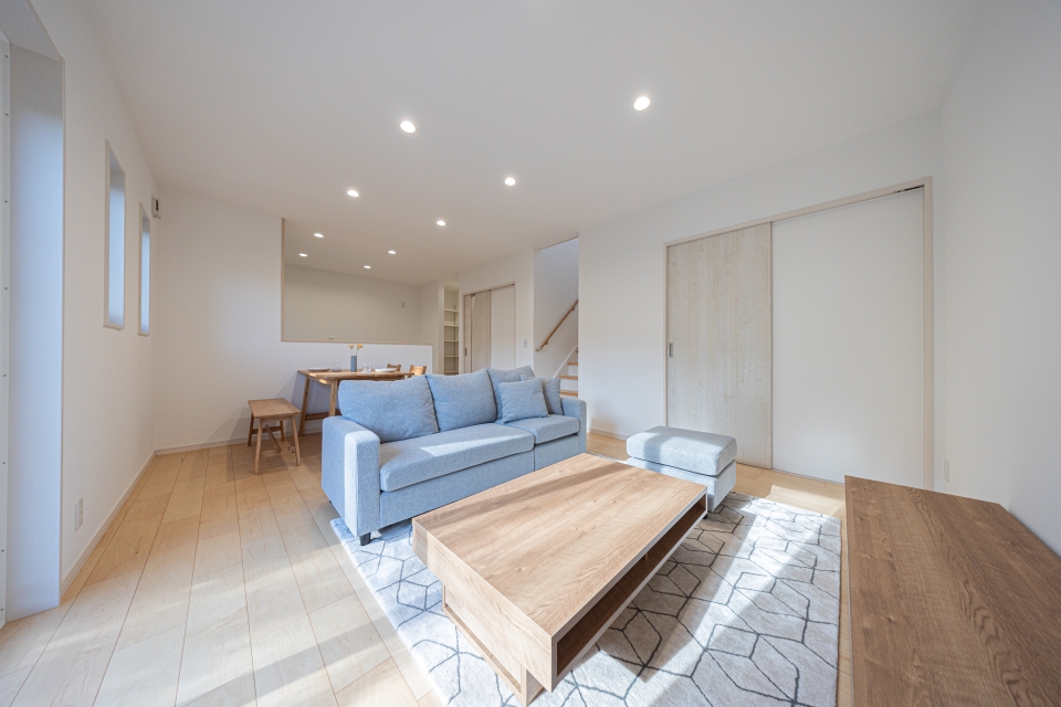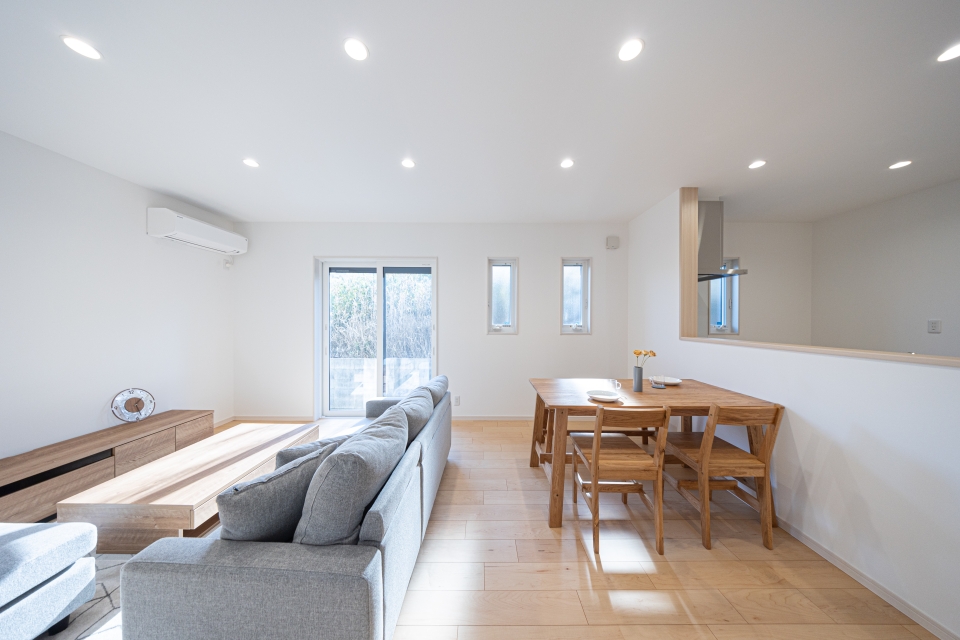ダイニングからリビングまでが一直線につながる配置です。 家具を置いても通路が確保しやすく、 人の動きとくつろぐ場所が重なりにくい構成です。 家族それぞれが同じ空間で過ごしやすい広さを意識しています。