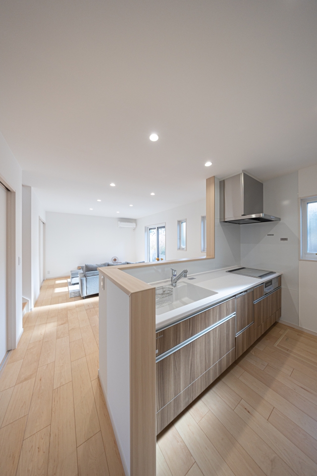 手元は落ち着いて作業でき、 視線はLDK側へ抜けるため、閉塞感が出にくい配置です。 家事と生活空間の距離感を意識しています。
