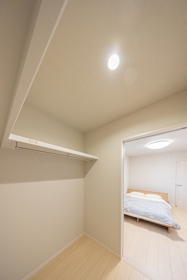 クローゼットが寝室の一角にまとまっているため、収納スペースとくつろぐ空間を分けて使えます。 生活感が出にくいのもポイントです。 棚とハンガーパイプを組み合わせ、衣類の種類に応じて収納できます。 服を選ぶ・出し入れするといった動作がスムーズです。