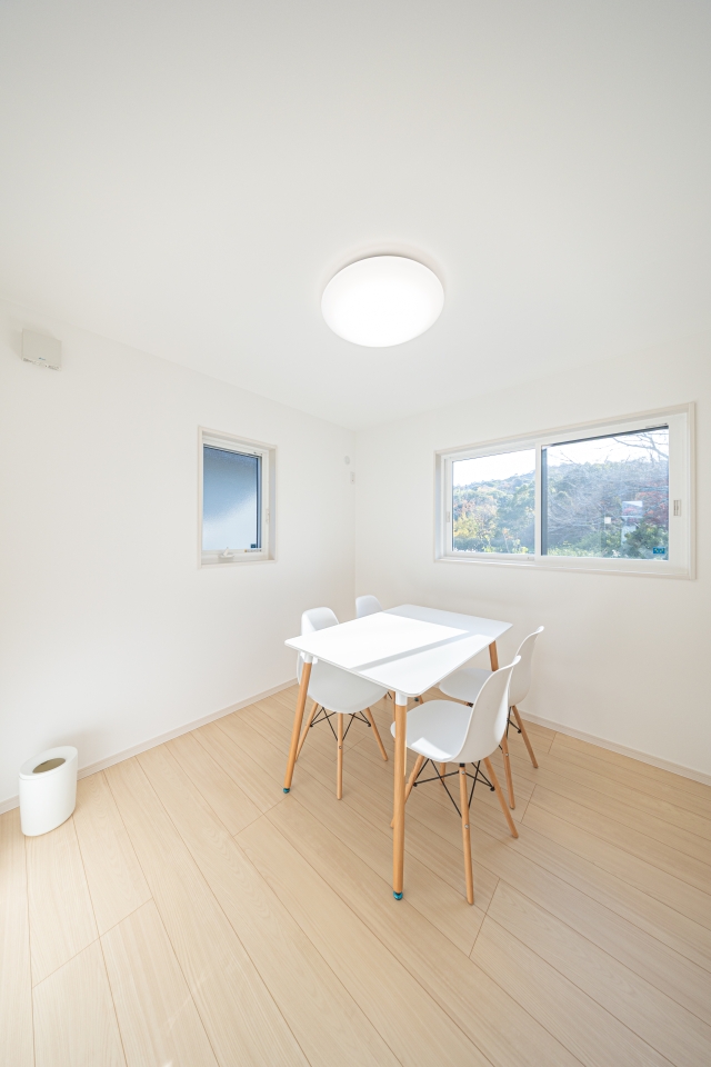 白を基調にした内装で、余計な装飾を省いた寝室です。ベッドを置いても動線に余裕があり、朝の支度や就寝前の動きが自然に流れる広さを確保しています。
