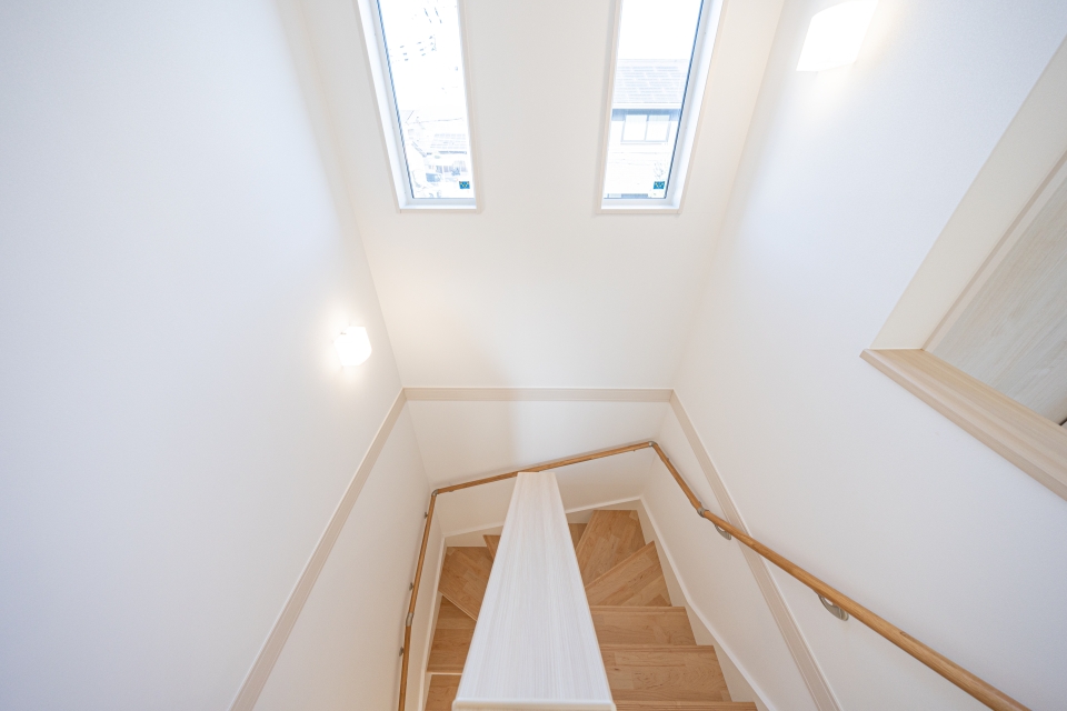 吹き抜けと縦長の窓から光を取り込み、2階だけでなく1階まで自然光が届く階段です。 昼間は照明をつけなくても明るく、移動のたびに閉塞感を感じにくい設計。 手すりも連続しているため、日常的に安心して使える動線になっています。