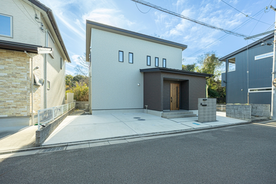 建物全体は、色数を抑えてシンプルにまとめています。 周囲の住宅と並んだときに浮かないこと、でも埋もれすぎないこと。そのバランスを意識しました。 正面はできるだけ凹凸を減らし、長く見ても飽きにくい外観にしています。