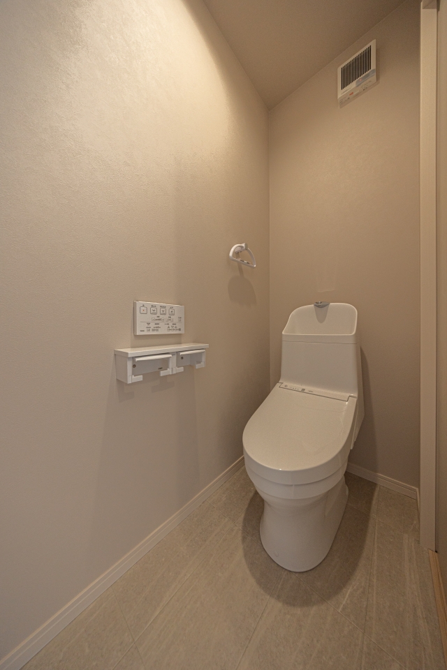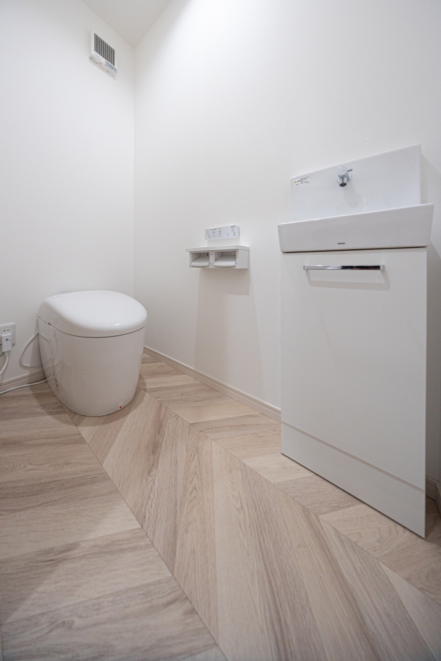 トイレは広すぎず、狭すぎず。掃除がしやすいサイズ感です。 手洗いは別に設けているため、トイレ内はすっきりと。 床や壁もシンプルな仕上げにして、清潔感を優先しています。