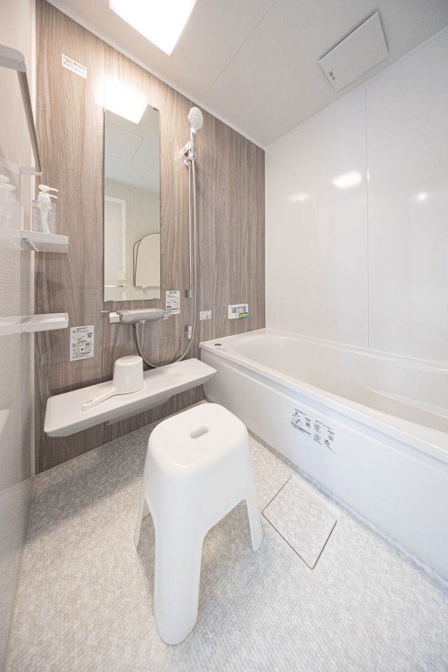 明るさと掃除のしやすさを重視した浴室です。 使う人がどう動くかを基準に考えています。 家事の中でも負担になりやすい場所なので、「手入れしやすい」は大事なポイントです。
