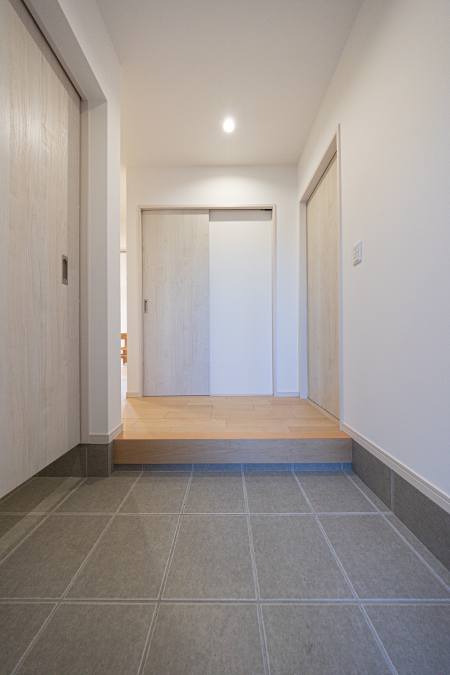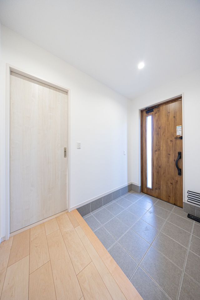 玄関を開けたときに、奥まで見渡せる配置にしています。 閉塞感が出にくく、実際の広さ以上にゆとりを感じやすい空間です。 玄関は家の第一印象になるので、明るさと抜けを意識しました。