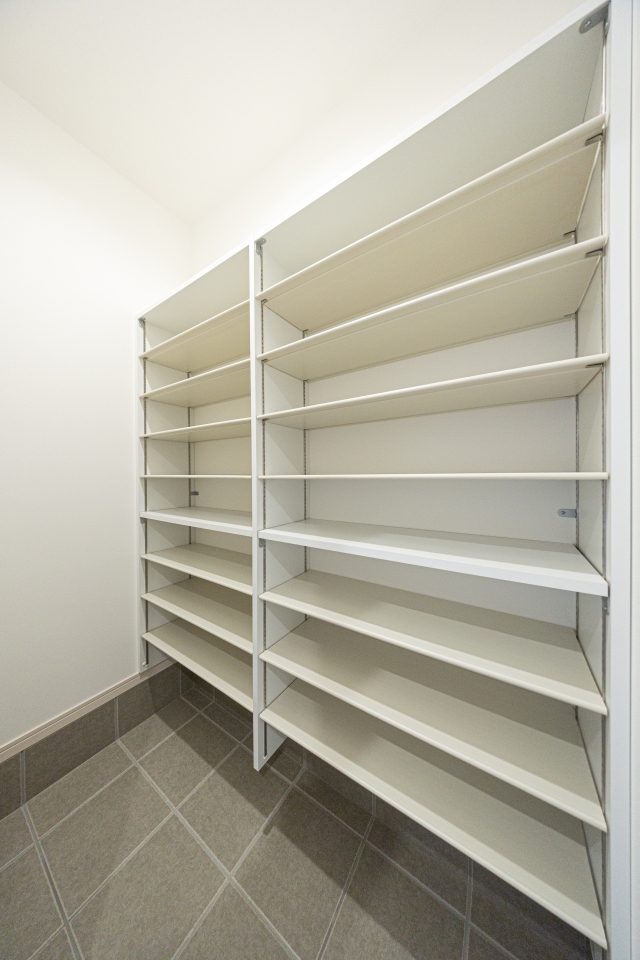 靴の数や高さに合わせて、棚の位置を変えられる収納です。 家族構成や暮らし方が変わっても対応しやすいよう、固定しすぎないつくりにしています。 玄関をすっきり保つための裏方的な場所です。