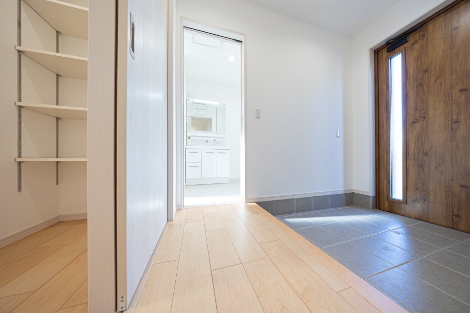 玄関土間は、人が立って靴を脱ぎ履きしても窮屈に感じにくい広さを確保しています。 荷物を持った状態でも動きやすく、玄関での動作が重なっても使いやすい空間です。 シューズクロークも土間に隣接しているため、 収納スペースを含めて玄関全体を広く使える構成になっています。