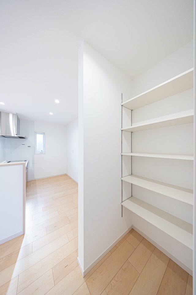 LDKの近くに収納を設けることで、 日用品やストック品をまとめて管理できます。 使う場所の近くに収納を置くことで、 片付けの動作が短くなるよう考えています。