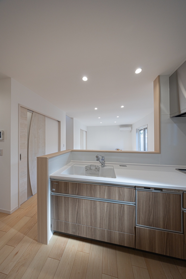 手元は落ち着いて作業でき、 視線はLDK側へ抜けるため、閉塞感が出にくい配置です。 家事と生活空間の距離感を意識しています。