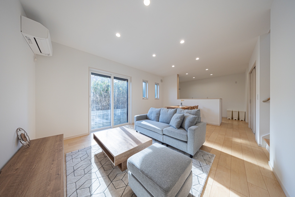 リビングは壁面をしっかり確保し、 ソファやテレビの配置が決めやすい形です。 大きな窓から光が入り、 昼間は照明に頼りすぎず過ごせます。