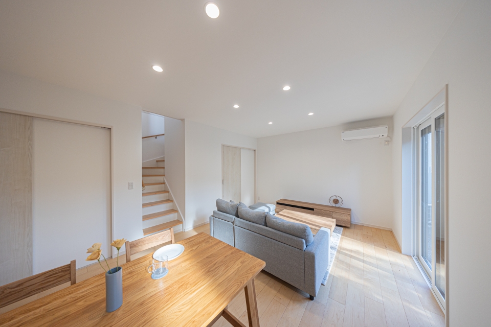 ダイニングからリビングまでが一直線につながる配置です。 家具を置いても通路が確保しやすく、 人の動きとくつろぐ場所が重なりにくい構成です。 家族それぞれが同じ空間で過ごしやすい広さを意識しています。