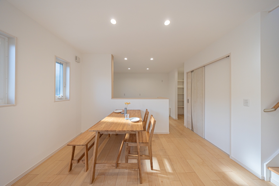 リビングとダイニング、キッチンをひとつながりに配置し、日常の動きが自然につながるように計画しました。 階段や吹き抜けを通して上下階の気配が感じられるため、家族それぞれが別の場所にいても、程よい距離感を保てる住まいです。 家具の配置がしやすいシンプルな間取りと、明るさを確保する窓計画により、暮らし始めてからも使い勝手の良さを実感していただけると思います。