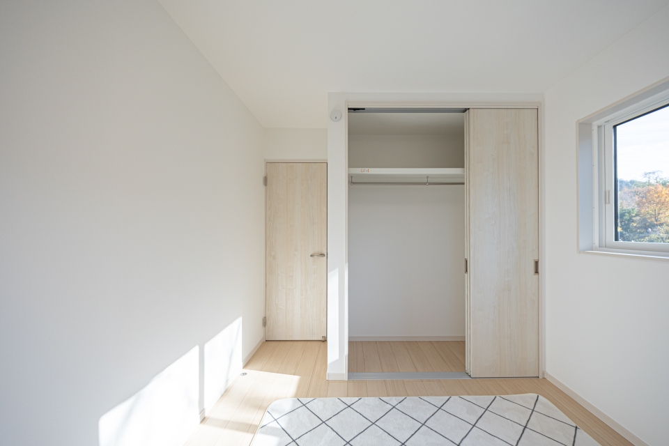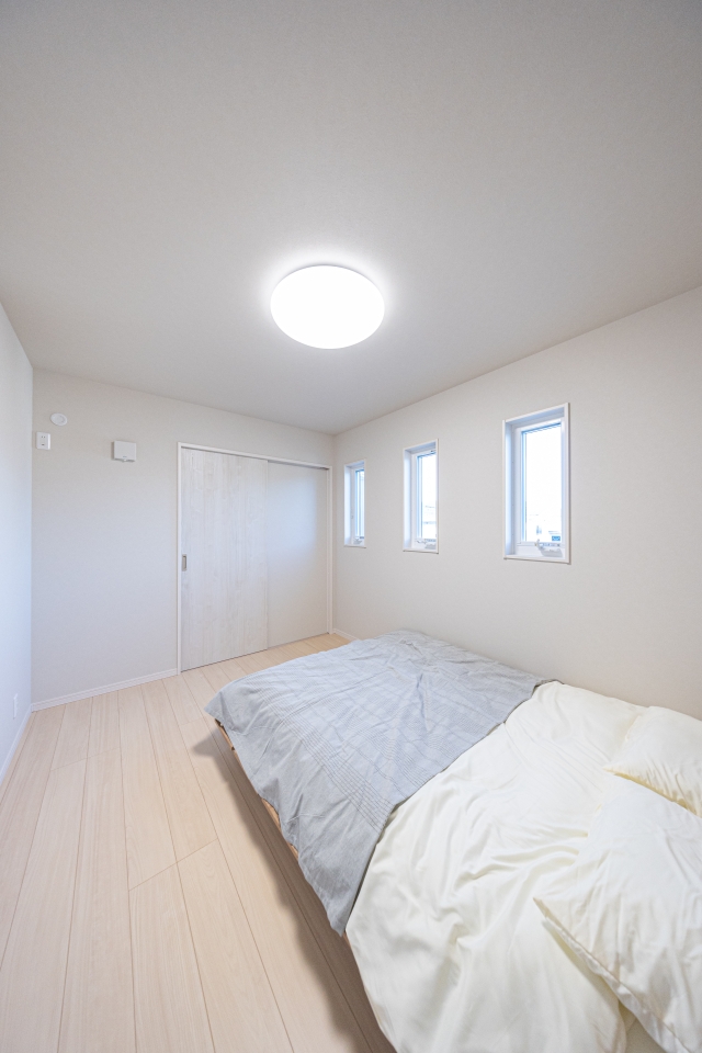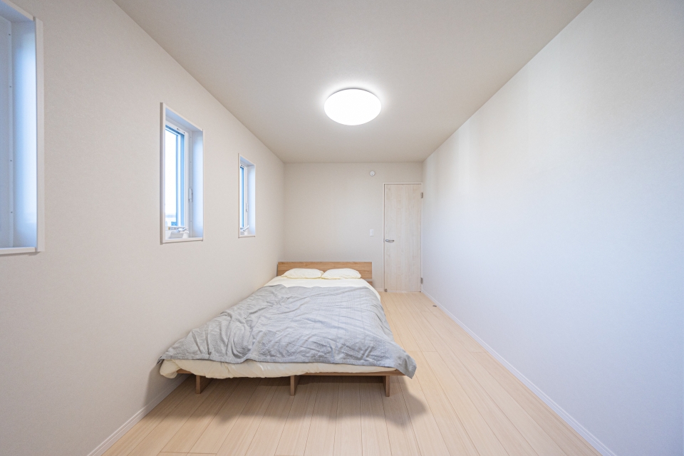 白を基調にした内装で、余計な装飾を省いた寝室です。ベッドを置いても動線に余裕があり、朝の支度や就寝前の動きが自然に流れる広さを確保しています。