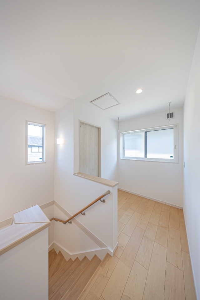 吹き抜けと縦長の窓から光を取り込み、2階だけでなく1階まで自然光が届く階段です。 昼間は照明をつけなくても明るく、移動のたびに閉塞感を感じにくい設計。 手すりも連続しているため、日常的に安心して使える動線になっています。